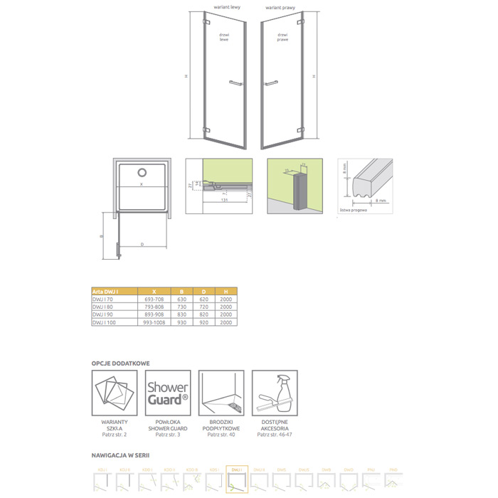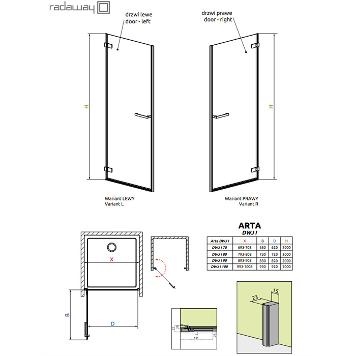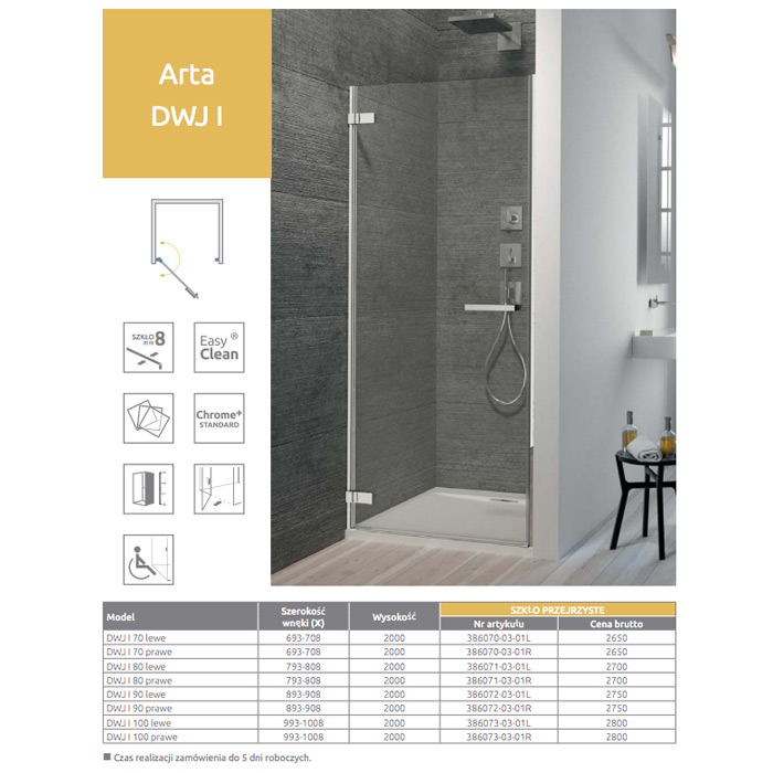 Radaway Arta DWJ I – одностворчатая дверь в нишу. Дверь открывается внутрь и наружу. Серия Arta DWJ I предлагает лишь прозрачное стекло. Все стекла Radaway с покрытием Easy Clean, созданным специально для удобства. Само покрытие прозрачное и незаметное, но помогает содержать в чистоте душевую кабину, благодаря инновационным технологиям, когда капли воды не «зависают» на стекле, оставляя следы, а плавно стекают вниз. Высота двери составляет 200 см, а ширина варьируется в диапазоне 70-100 см.