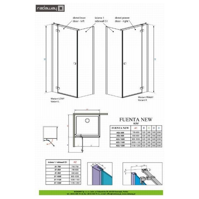 В комплект уголка Fuenta New KDJ входит распашная дверь (левый или правый вариант) и боковая стенка (приобретается отдельно). Створка двери открывается наружу.