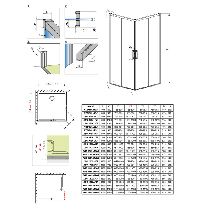 Уголки изготавливаются из закаленного стекла. Душевые уголки могут иметь форму полукруга, прямоугольника и квадрата. В основном, их габариты рассчитаны на небольшие ванные комнаты. Дверцы и стенки душевых уголков покрыты специальным слоем «Easy Clean», которое препятствует появлению разводов и пятен от воды на уголке.