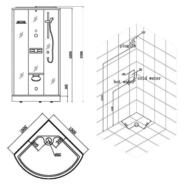 Оснащение: тропический душ, штанга для душа, полочки, сиденье