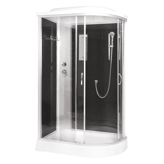 Cтильная модель с низким поддоном. Ее габариты (80х120 см) не загромождают ванную комнату, но в то же время наделяют внутреннее пространство кабины достаточной вместительностью. Душевая кабина укомплектована ручной лейкой, верхним душем, стеклянной полкой и зеркалом.