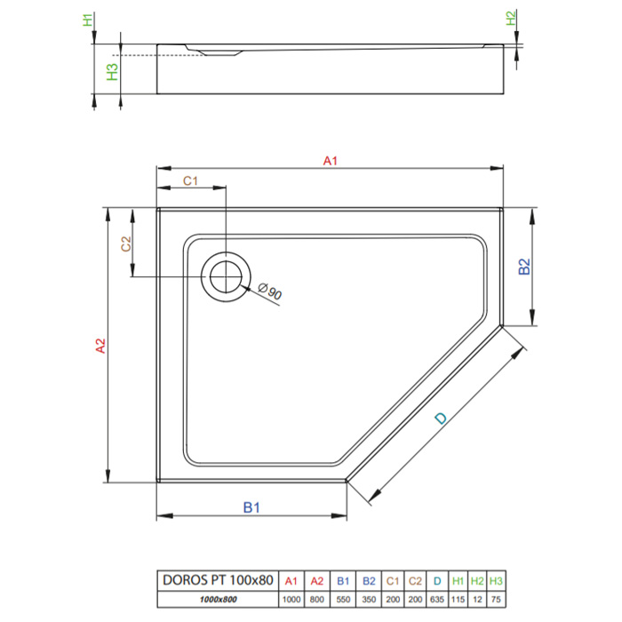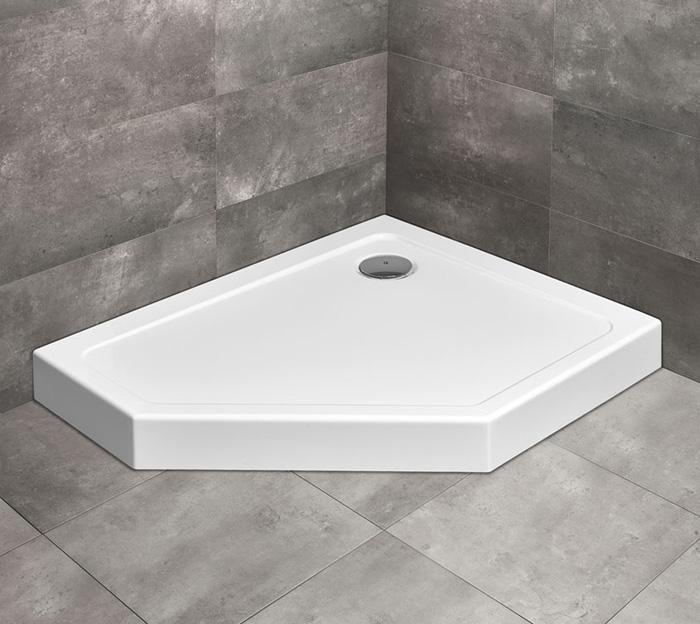Плоский, 5-угольный акриловый поддон с цельнолитой панелью (с 5-ти сторон). Предназначен для монтажа на ножках (в комплекте). Отверстие для сифона O90 мм.