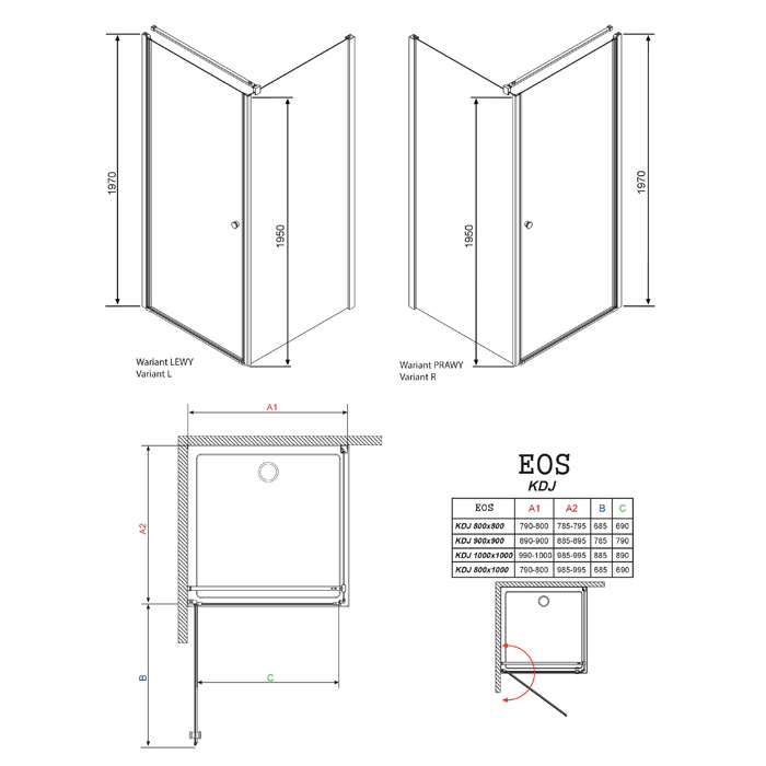 Radaway Eos KDJ – квадратная душевая кабина одностворчатой распашной дверью, которая открывается внутрь и наружу. Кабина выполнена в правом и левом вариантах, на что нужно обязательно обратить внимание при заказе.