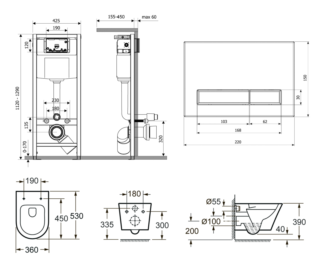 Система инсталляции по умолчанию укомплектована короткими и удлиненными кронштейнами. Удлиненный комплект креплений упрощает до минимума монтаж инсталляции в любую типовую сантехническую шахту (особенно "хрущевские" санузлы) вне зависимости от расположения стояков, водопроводных труб и других инженерных коммуникаций. Рама для подвесного унитаза оснащена бачком скрытого монтажа, корпус которого изготовлен из долговечного полимерного материала HDPE.