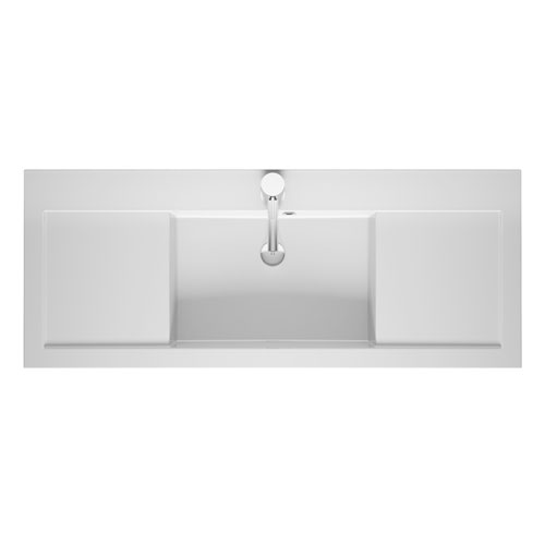 Умывальник имеет две полочки, расположенные по бокам. Также имеется отверстие под один смеситель и отверстие под слив.