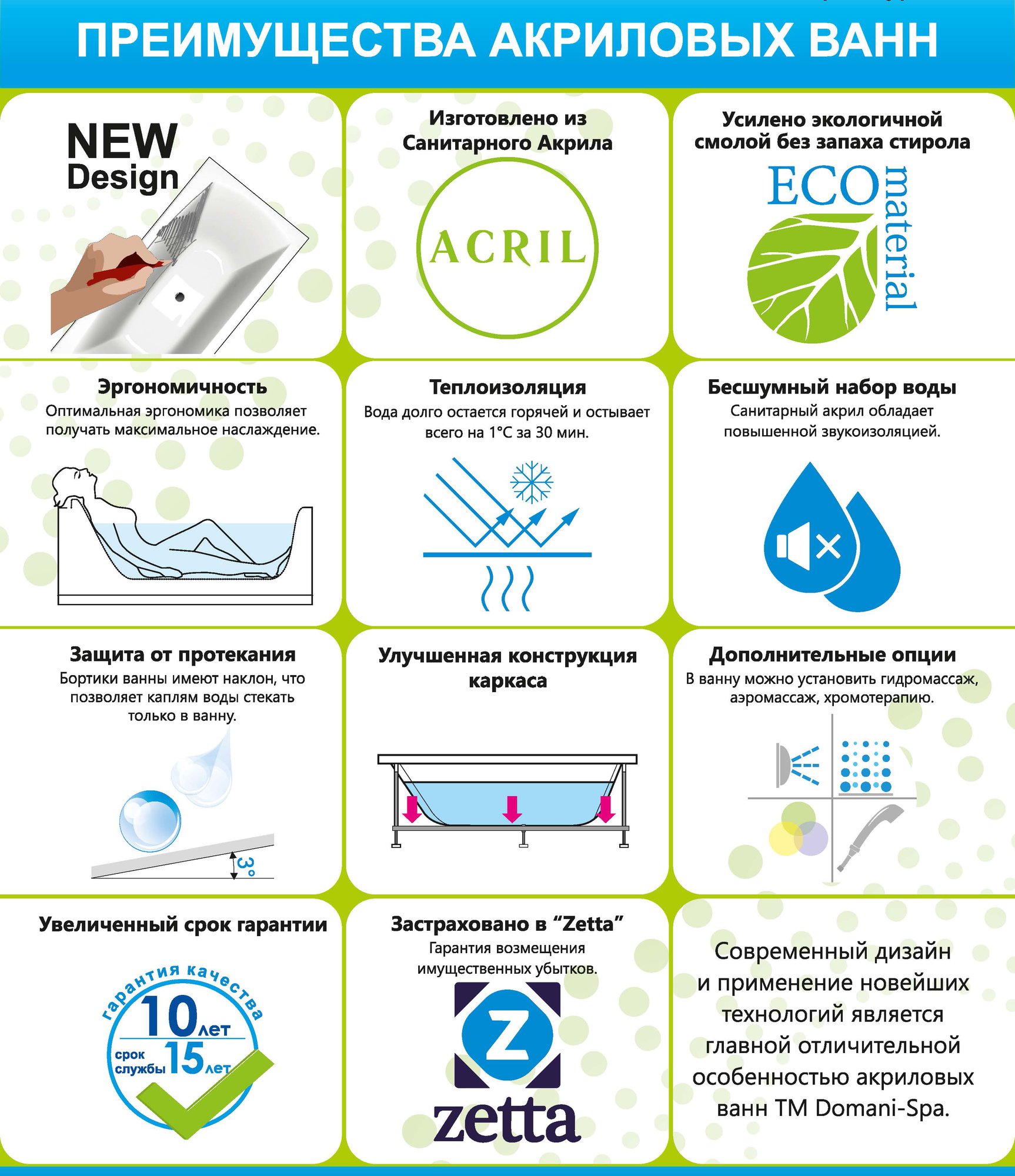 ООО «Домани-Спа» - российский производитель душевых кабин и ванн. Ванны Domani-Spa производятся исключительно из санитарного акрила - материал белого цвета, глянцевая поверхность которого всегда сохраняет первоначальный блеск и цвет, так как цветовые пигменты в нем распределены равномерно по всей толщине. Это самый гигиеничный материал. Благодаря высокой степени плотности, не впитывает микробы и легко чистится. Пластичный и очень прочный материал. Эластичная структура делает его устойчивым к удару. Повреждения на поверхности (царапины) легко исправить путем полировки.